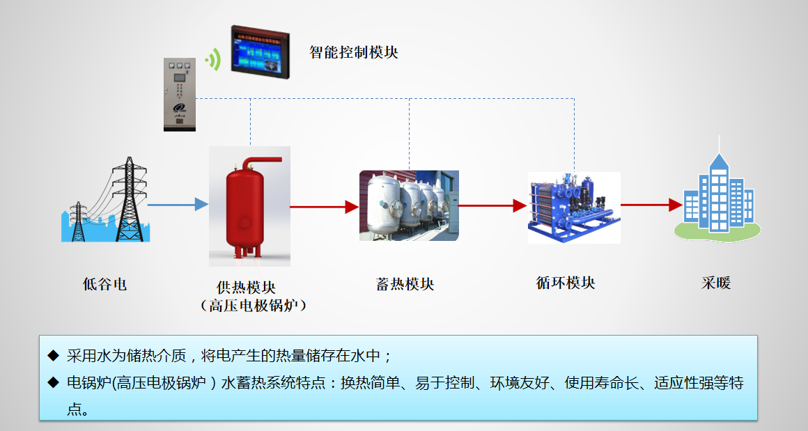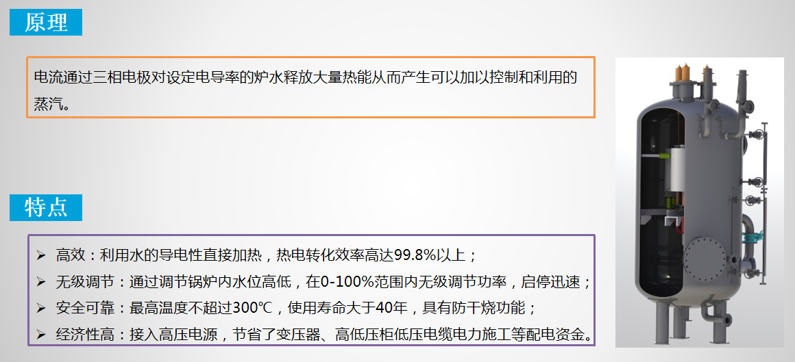 原理(lǐ):電(diàn)極浸沒在一定電(diàn)導率的水中(zhōng),通電(diàn)後,由于水的導電(diàn)性,産(chǎn)生電(diàn)流,生熱将水變成高溫水或蒸汽,通過鍋爐外置換熱裝(zhuāng)置可(kě)儲存,也可(kě)直接供給用(yòng)戶。