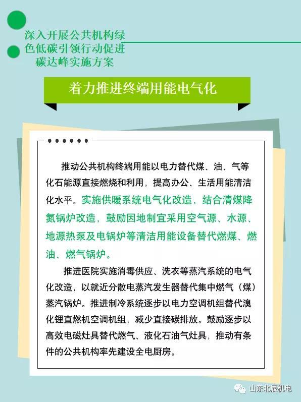 (一)着力推進終端用(yòng)能(néng)電(diàn)氣化。推動公(gōng)共機構終端用(yòng)能(néng)以電(diàn)力替代煤、油、氣等化石能(néng)源直接燃燒和利用(yòng),提高辦(bàn)公(gōng)、生活用(yòng)能(néng)清潔化水平。實施供暖系統電(diàn)氣化改造,結合清煤降氮鍋爐改造,鼓勵因地制宜采用(yòng)空氣源、水源、地源熱泵及電(diàn)鍋爐等清潔用(yòng)能(néng)設備替代燃煤、燃油、燃氣鍋爐。推進醫(yī)院實施消毒供應、洗衣等蒸汽系統的電(diàn)氣化改造,以就近分(fēn)散電(diàn)蒸汽發生器替代集中(zhōng)燃氣(煤)蒸汽鍋爐。推進制冷系統逐步以電(diàn)力空調機組替代溴化锂直燃機空調機組,減少直接碳排放。鼓勵逐步以高效電(diàn)磁竈具(jù)替代燃氣、液化石油氣竈具(jù),推動有(yǒu)條件的公(gōng)共機構率先建設全電(diàn)廚房。